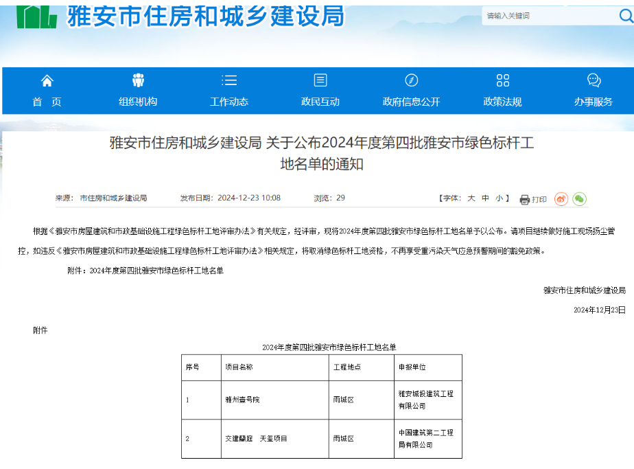 12月23日,雅安市住房和城鄉(xiāng)建設(shè)局發(fā)布了《關(guān)于公布2024年度四批雅安市綠色標(biāo)桿工地名單的通知》,雅安交建集團蘭庭•天璽項目,以卓越的綠色實踐榮獲“雅安市綠色標(biāo)桿工地”殊榮。