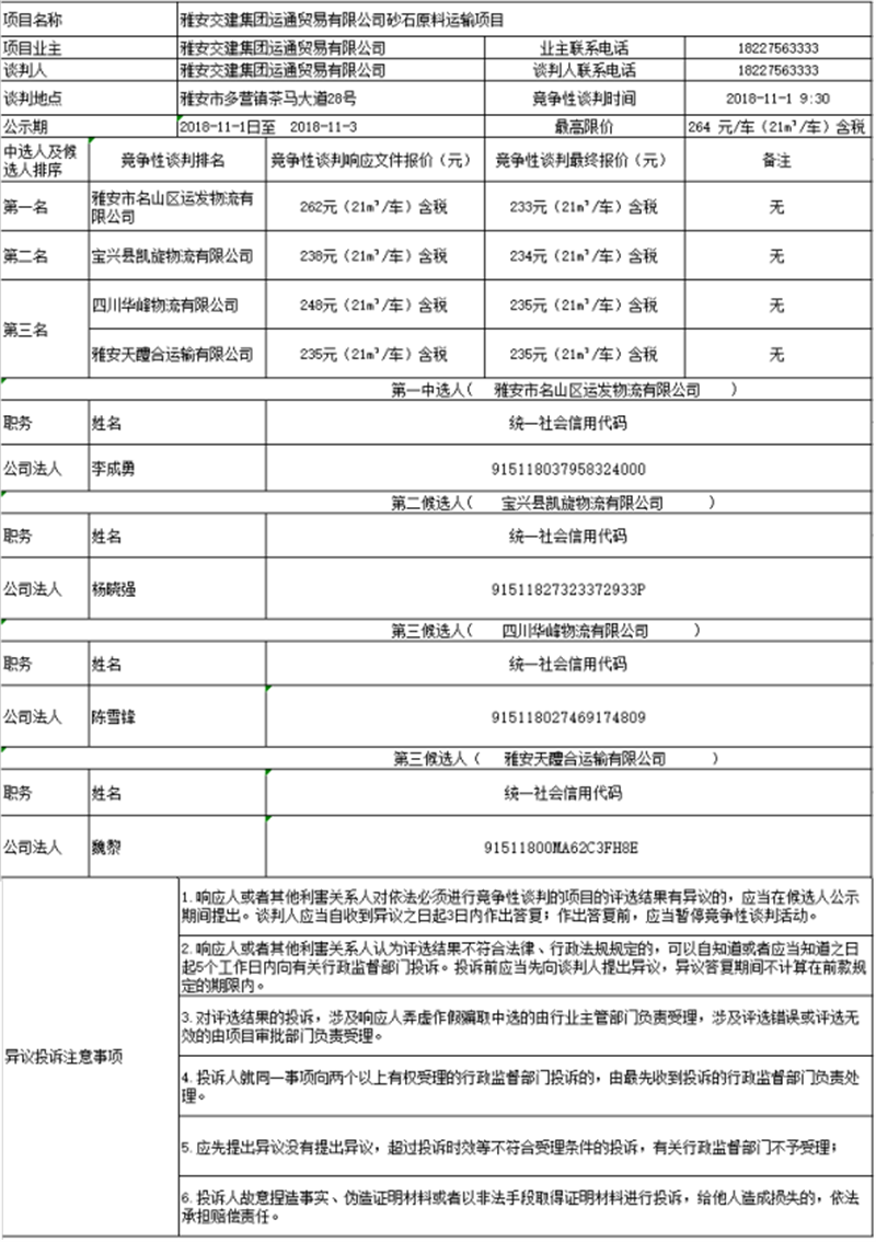 雅安交建集團(tuán)運(yùn)通貿(mào)易有限公司砂石原料運(yùn)輸項(xiàng)目競爭性談判中選人及候選人公示