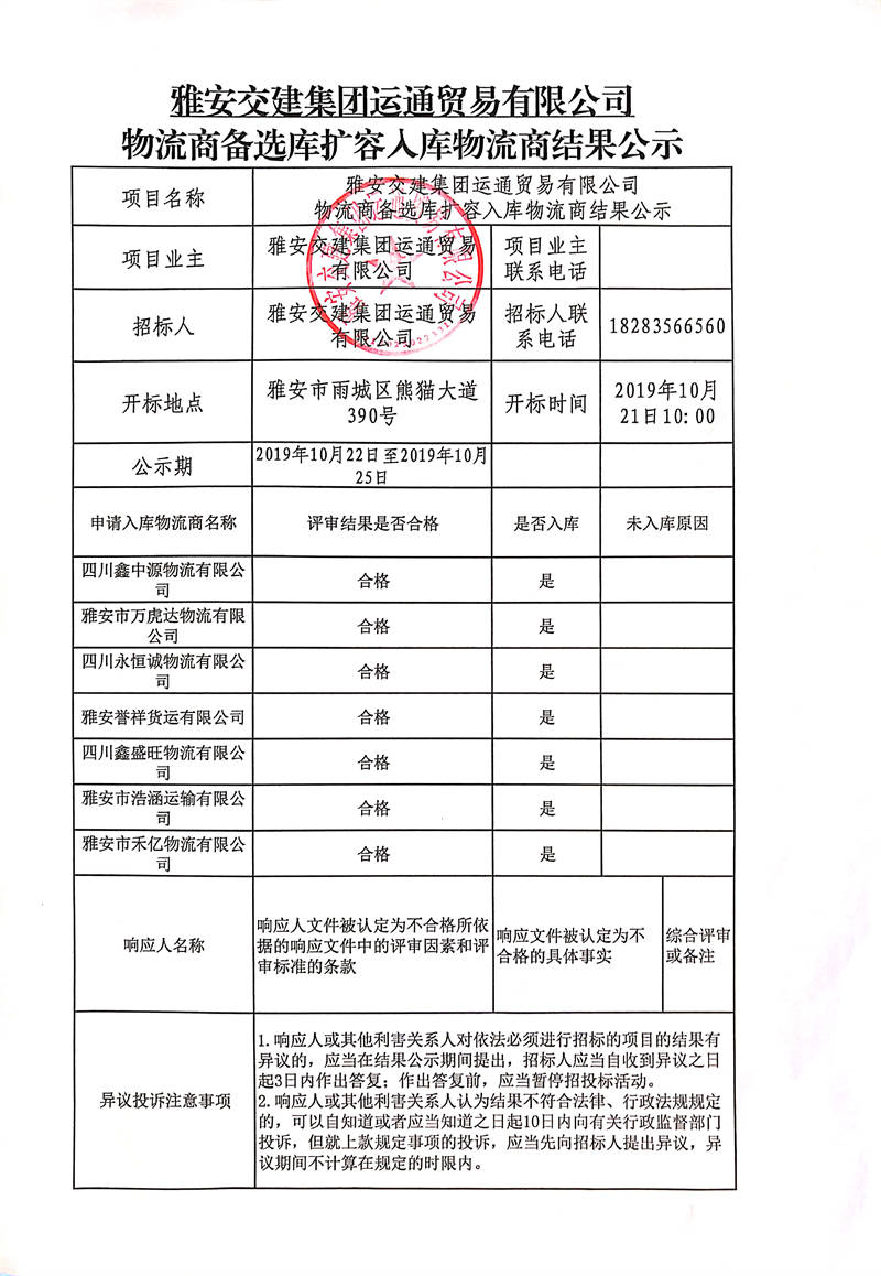 雅安交建集團運通貿易有限公司物流商備選庫擴容入庫物流商結果公示