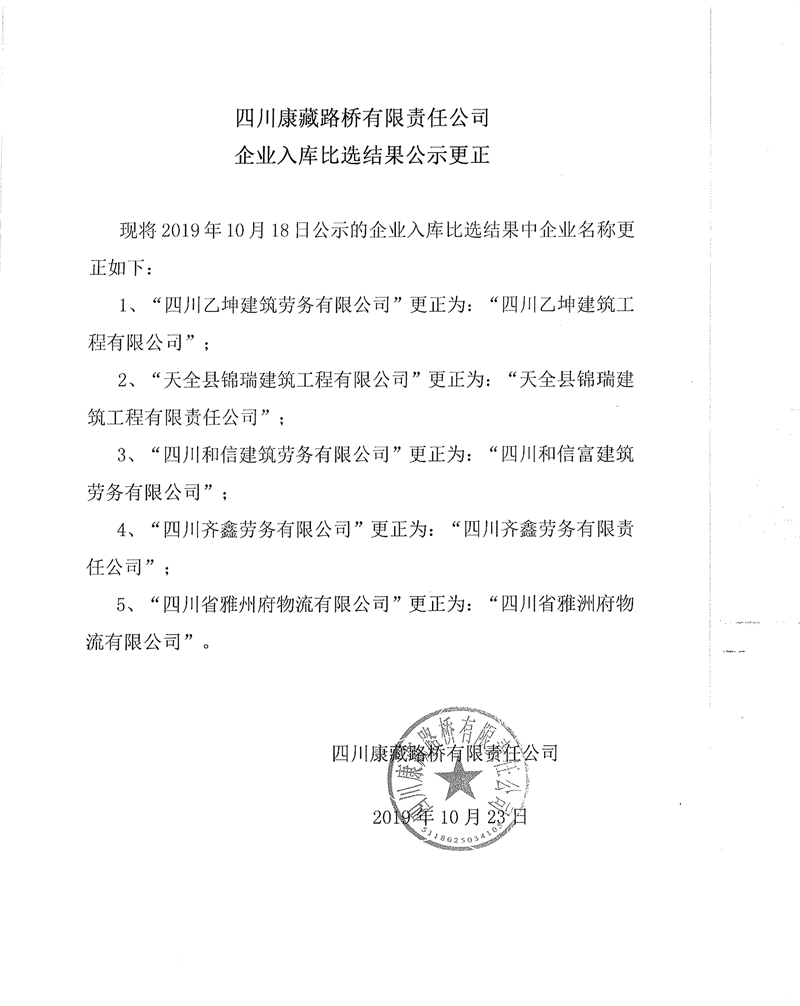 四川康藏路橋有限責(zé)任公司企業(yè)入庫(kù)比選結(jié)果公示更正