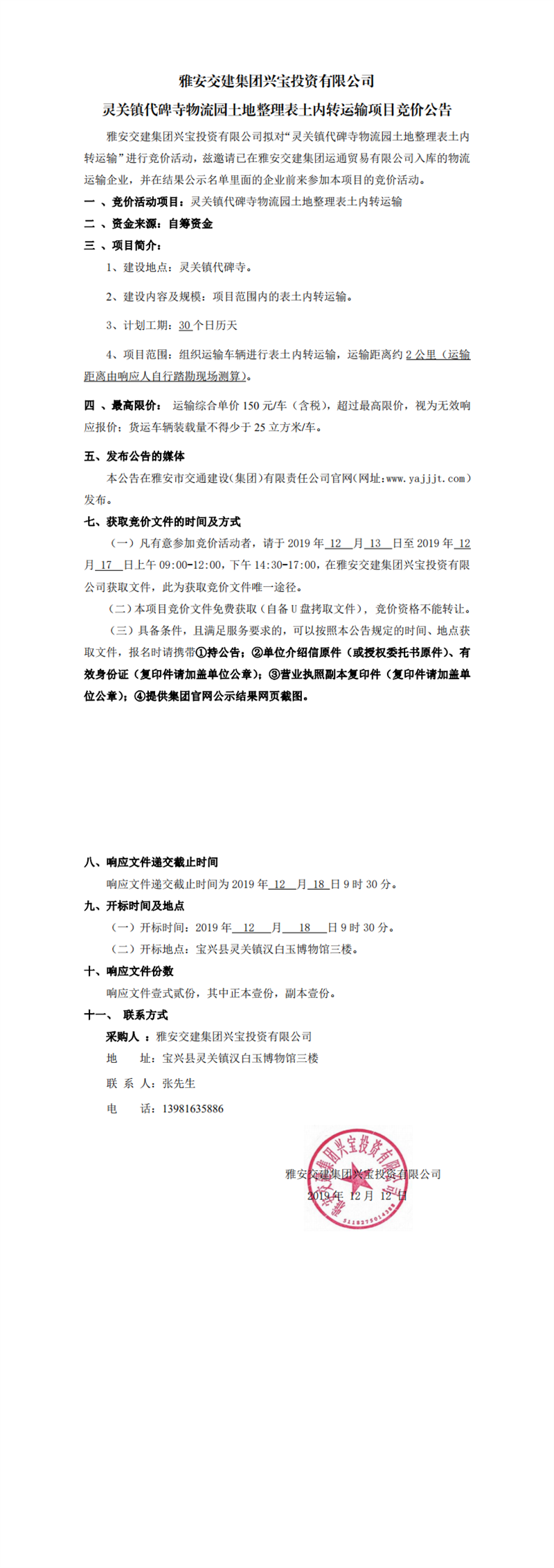 雅安交建集團(tuán)興寶投資有限公司靈關(guān)鎮(zhèn)代碑寺物流園土地整理表土內(nèi)轉(zhuǎn)運輸項目競價公告