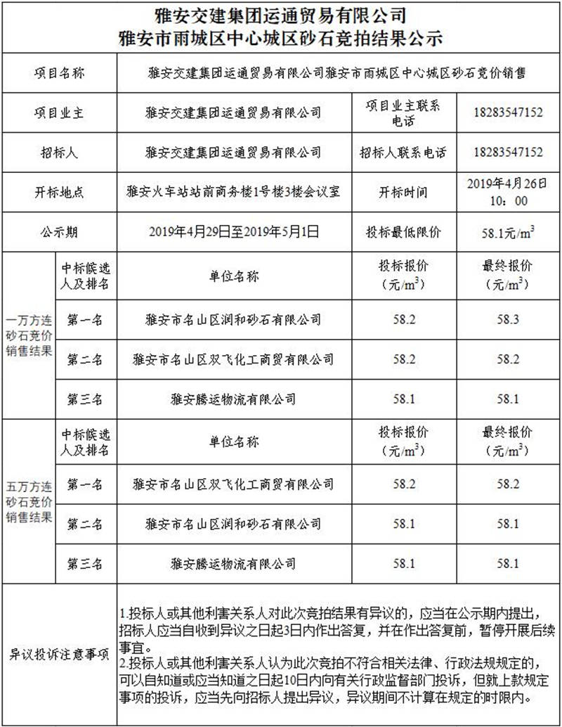 雅安交建集團運通貿易有限公司雨城區(qū)中心城區(qū)砂石競拍結果公示