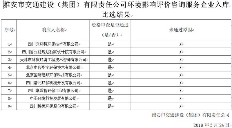 雅安市交通建設(shè)(集團)有限責任公司環(huán)境影響評價咨詢服務企業(yè)入庫比選結(jié)果公示