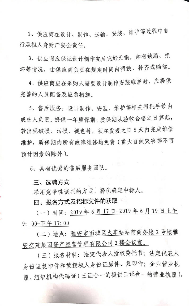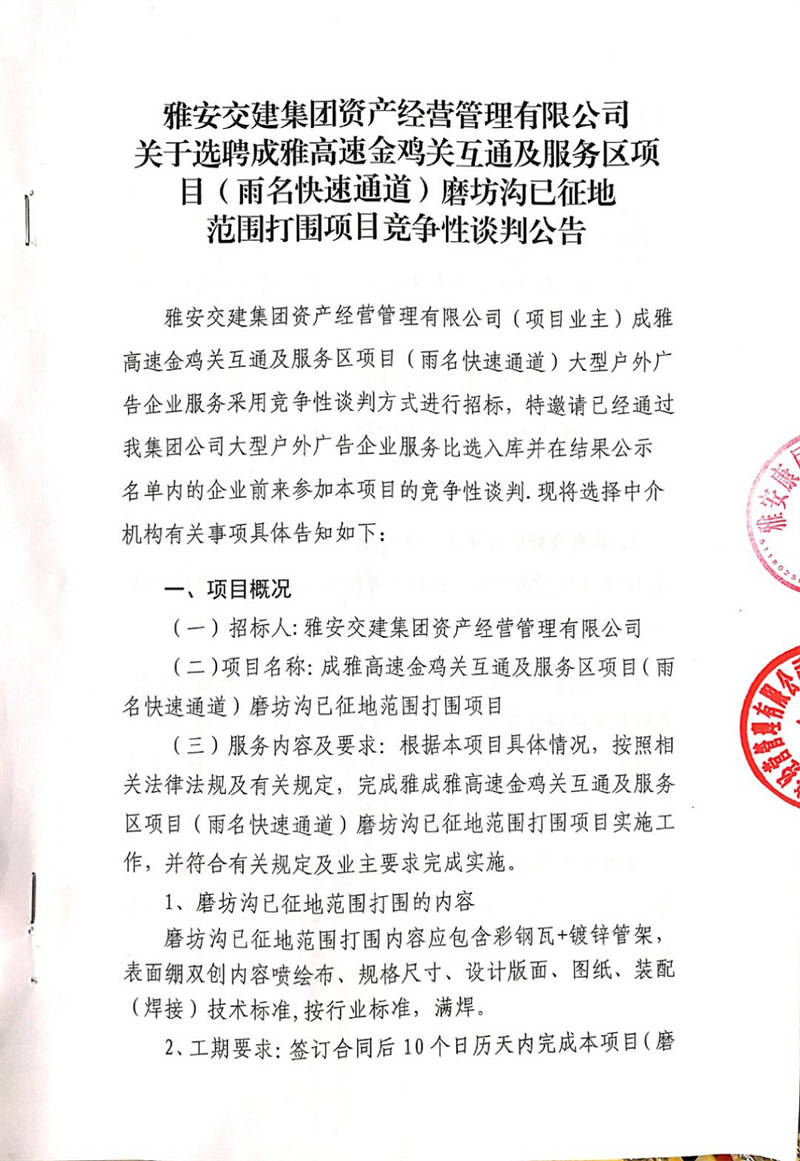 雅安交建集團資產(chǎn)經(jīng)營管理有限公司關于選聘成雅高速金雞關互通及服務區(qū)項目(雨名快速通道)磨坊溝已征地范圍打圍項目競爭性談判公告