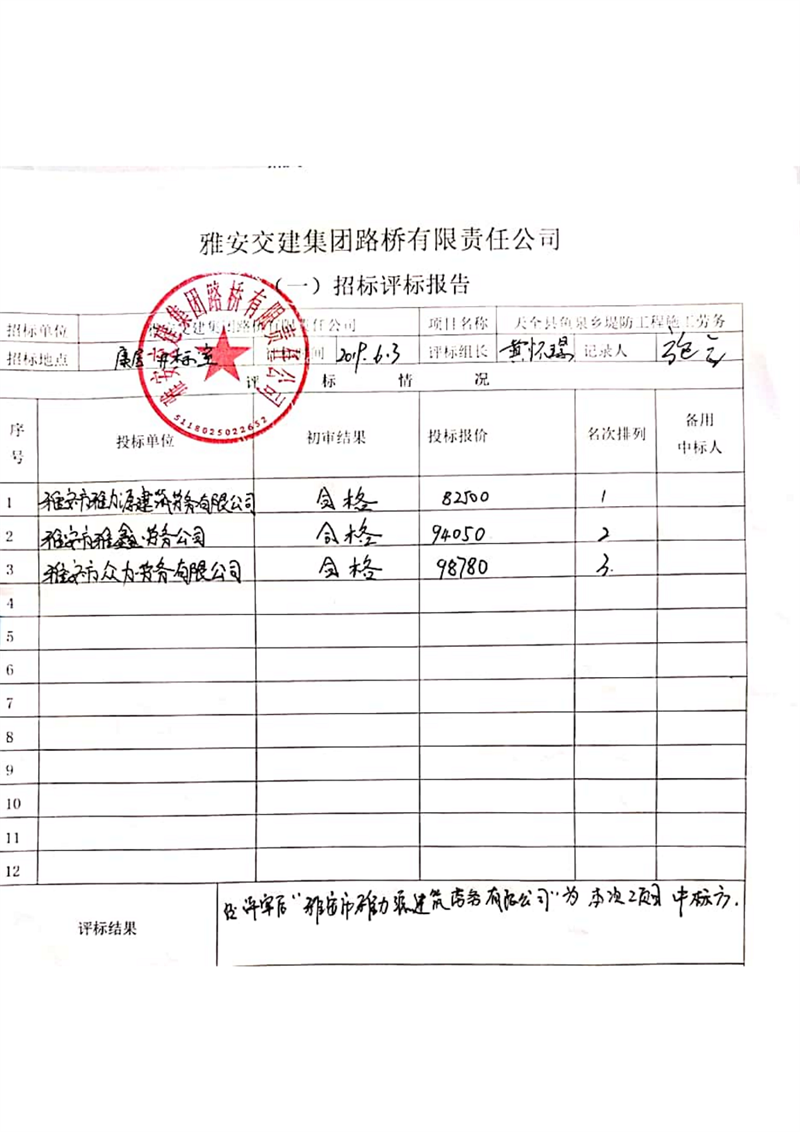 雅安交建集團(tuán)路橋有限責(zé)任公司天全縣魚泉鄉(xiāng)堤防工程施工勞務(wù)項(xiàng)目邀請(qǐng)招標(biāo)結(jié)果公示