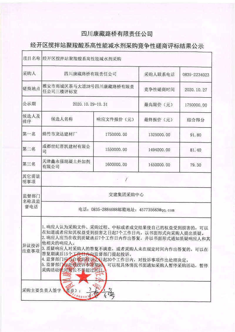 四川康藏路橋有限責任公司經開區(qū)攪攔站聚羧酸系高性能減水劑采購競爭性磋商評標結果公示