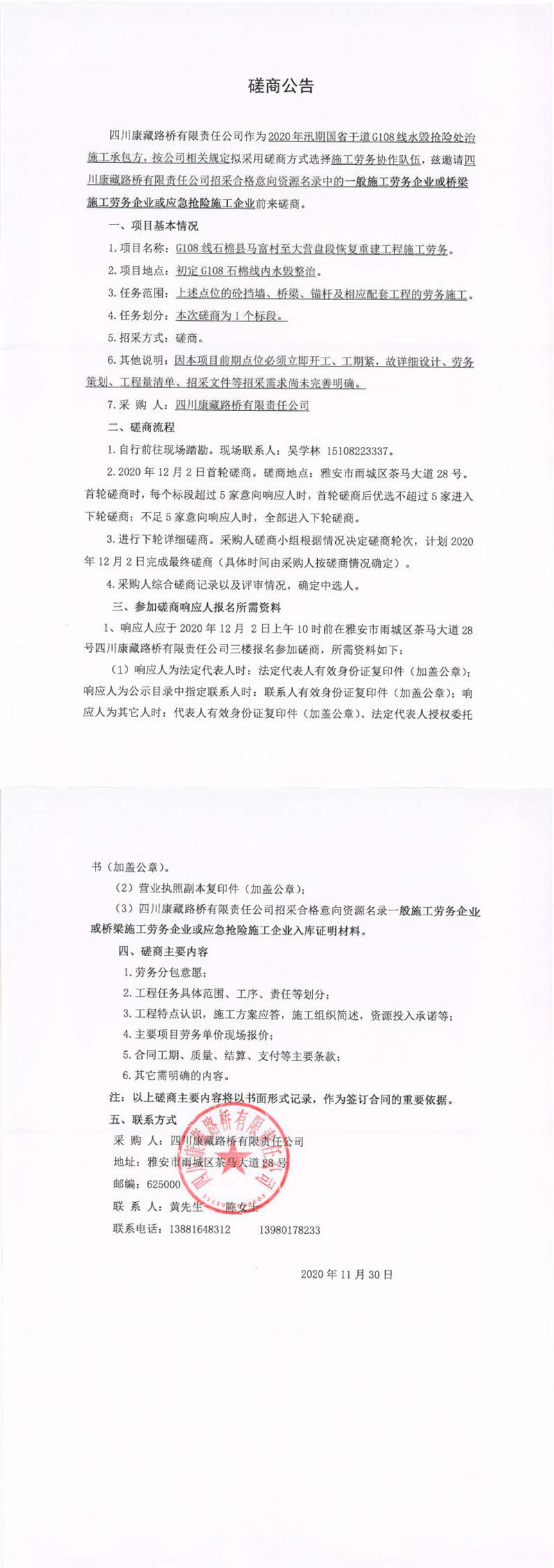 四川康藏路橋有限責任公司G108線石棉縣馬富村至大營盤段恢復重建工程施工勞務磋商公告