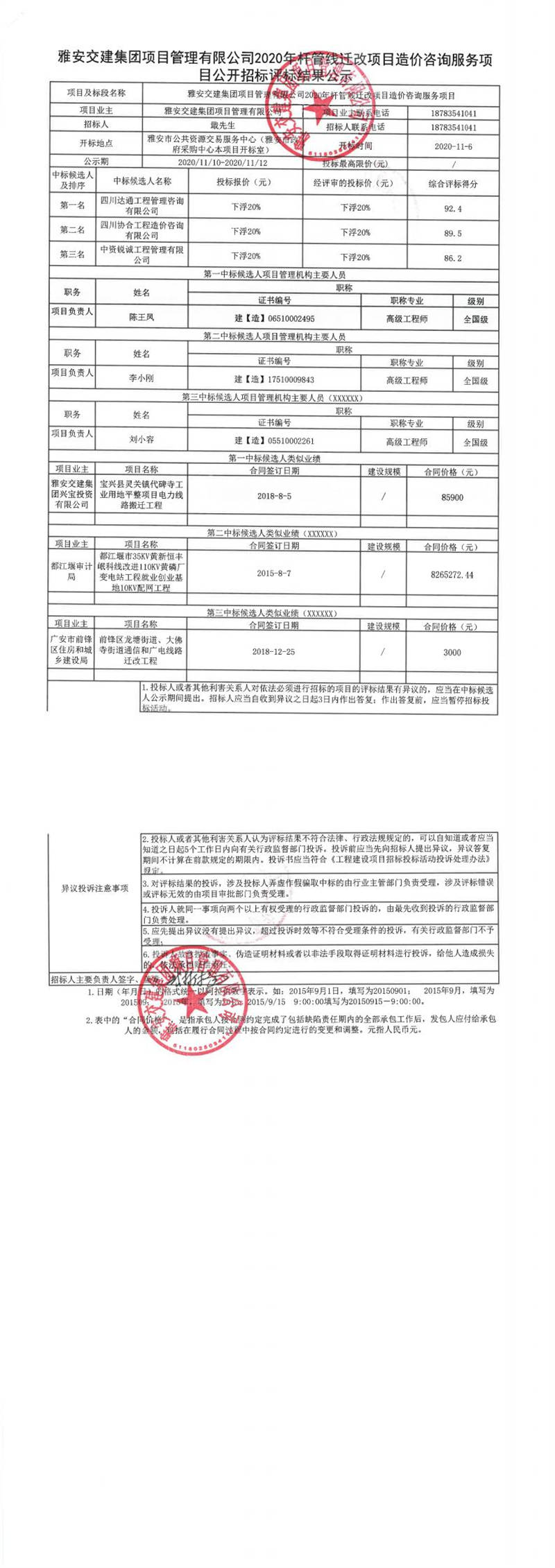 雅安交建集團(tuán)項(xiàng)目管理有限公司2020年桿管線遷改項(xiàng)目造價(jià)咨詢服務(wù)項(xiàng)目公開招標(biāo)評(píng)標(biāo)結(jié)果公示