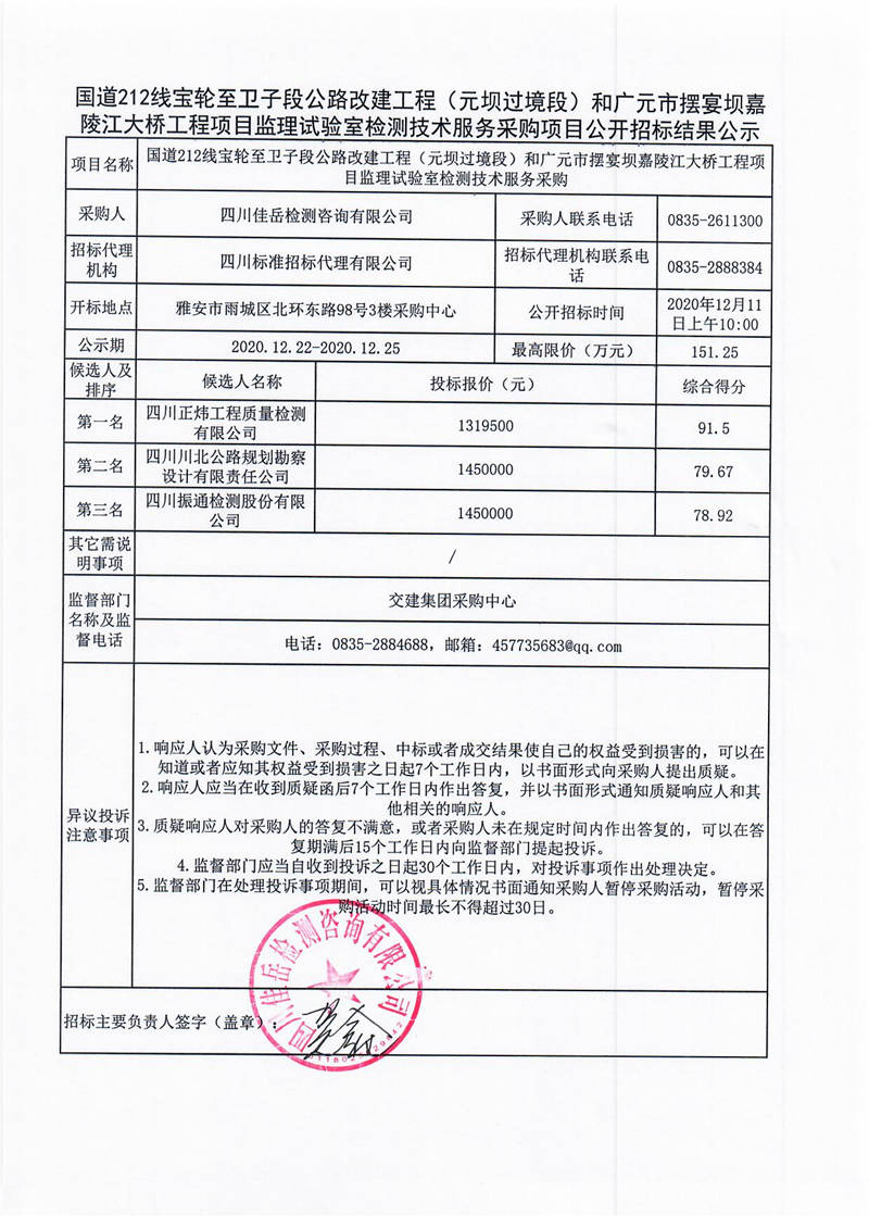 四川佳岳檢測咨詢有限公司國道212線寶輪至衛(wèi)子段公路改建工程(元壩過境段)和廣元市擺宴壩嘉陵江大橋工程項目監(jiān)理試驗室檢測技術(shù)服務(wù)采購項目公開招標結(jié)果公示