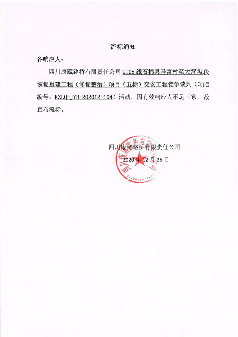 四川康藏路橋有限責(zé)任公司G108線石棉縣馬富村至大營盤段恢復(fù)重建工程(修復(fù)整治)項目(五標)交安工程流標通知
