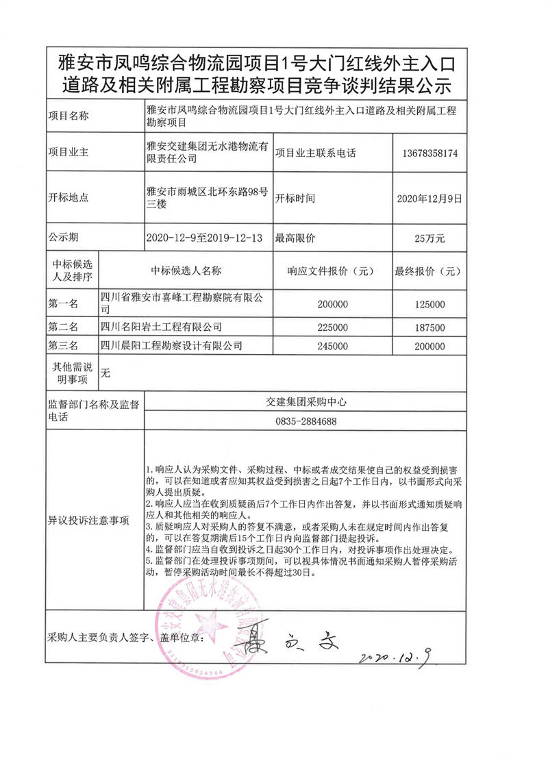雅安交建集團(tuán)無水港物流有限責(zé)任公司雅安市鳳鳴綜合物流園項(xiàng)目1號(hào)大門紅線外主入口道路及相關(guān)附屬工程勘察項(xiàng)目競(jìng)爭(zhēng)談判結(jié)果公示