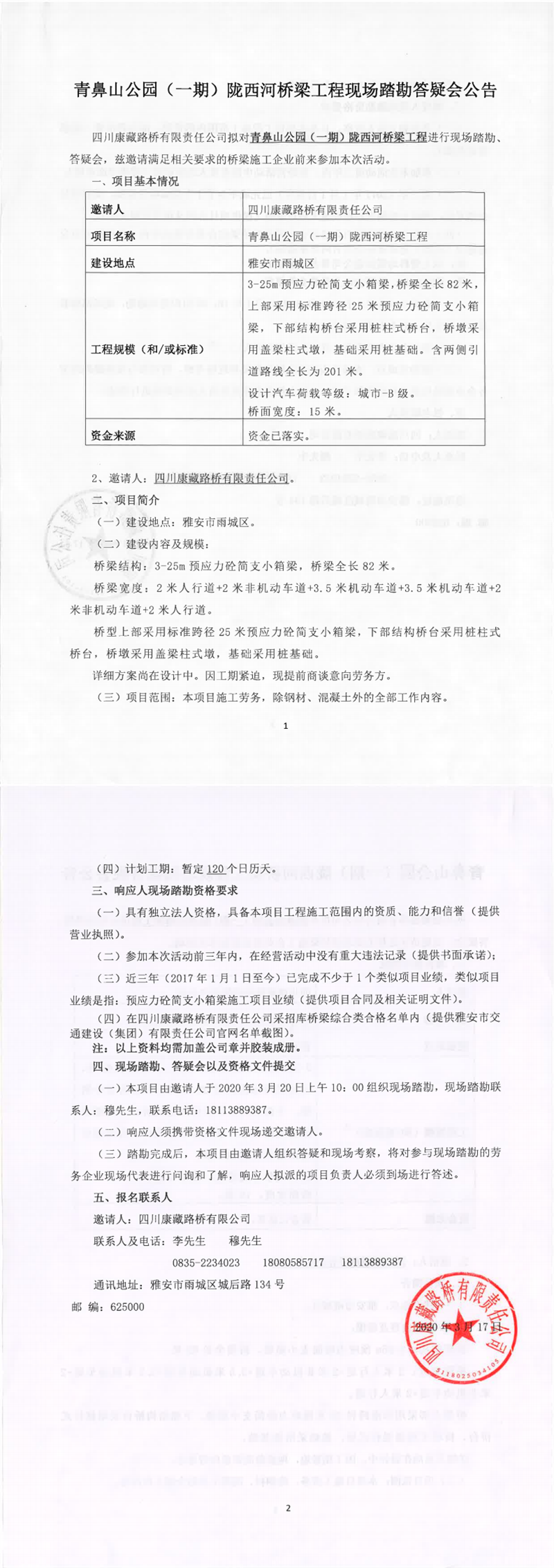 四川康藏路橋有限責(zé)任公司青鼻山公園(一期)隴西河橋梁工程現(xiàn)場踏勘答疑會(huì)公告