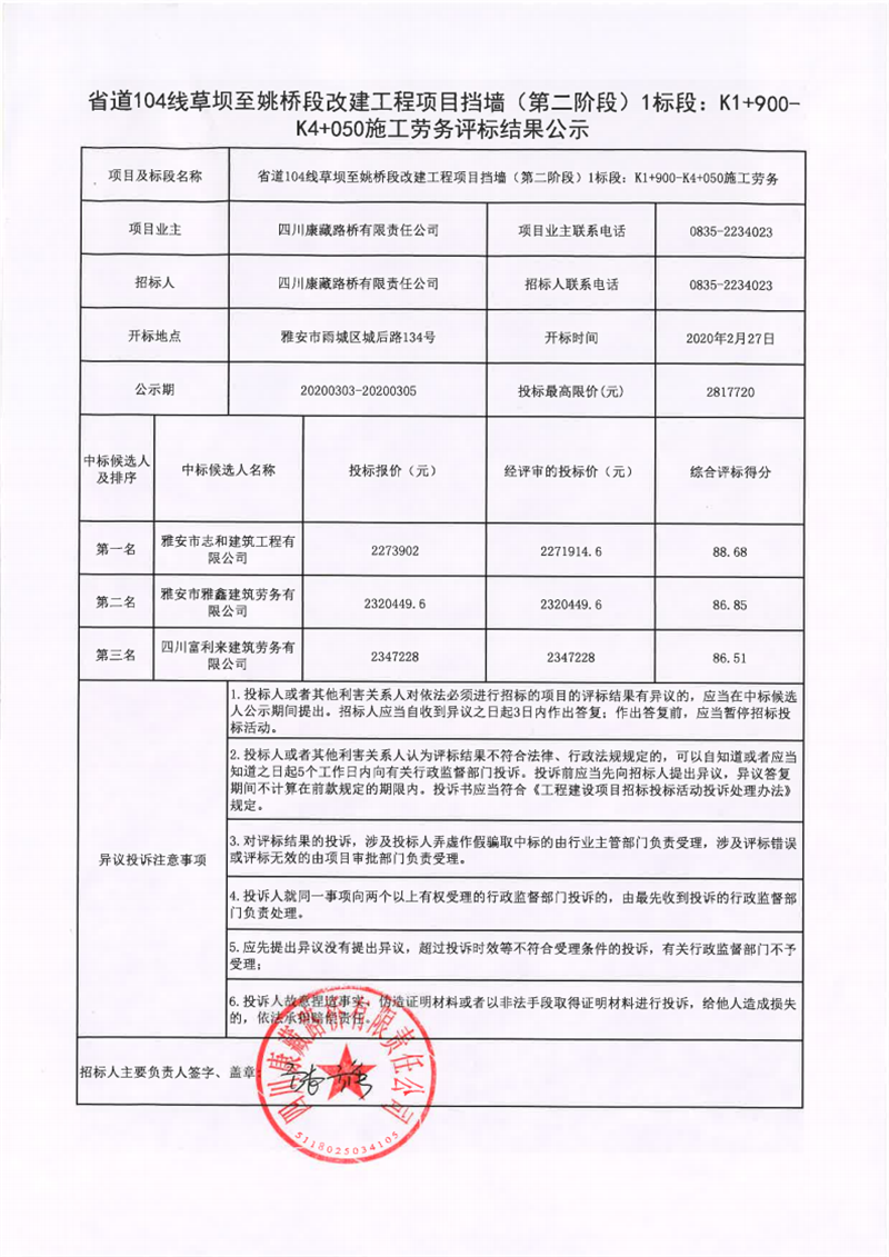 四川康藏路橋有限責(zé)任公司省道104線草壩至姚橋段改建工程項(xiàng)目擋墻(第二階段)1標(biāo)段:K1+900-K4+050施工勞務(wù)評標(biāo)結(jié)果公示