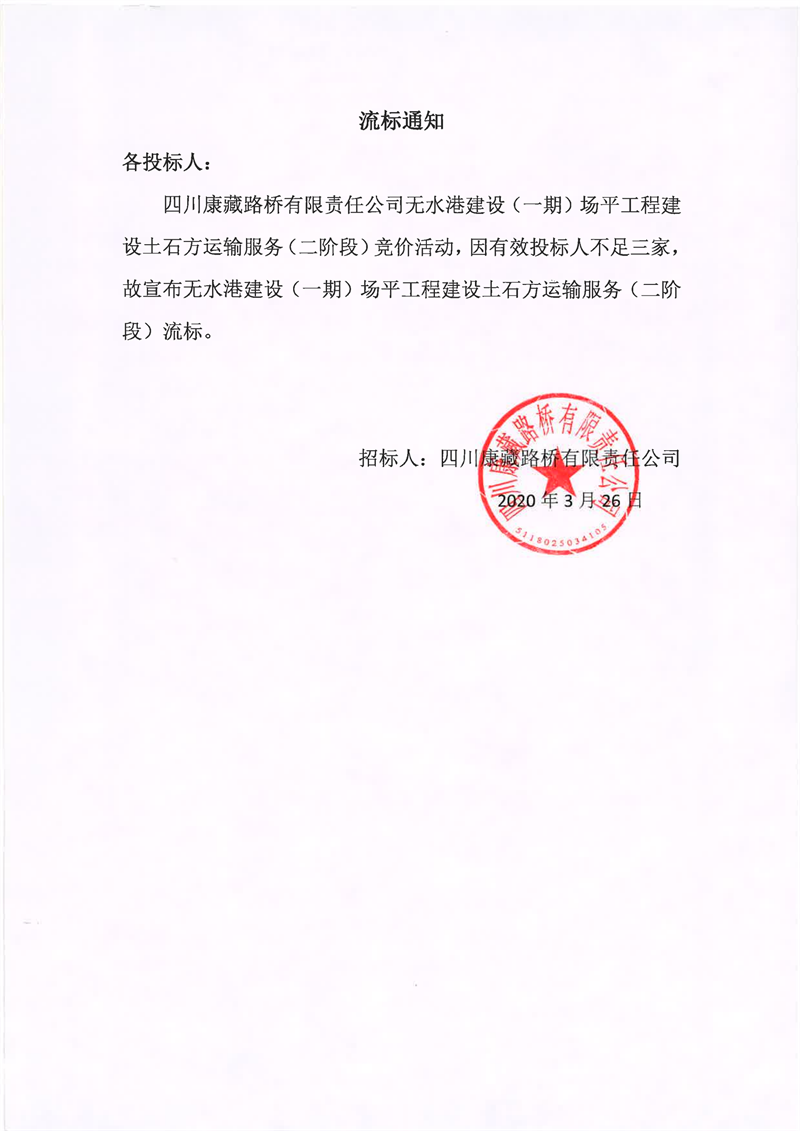 四川康藏路橋有限責任公司無水港建設(一期)場平工程建設土石方運輸服務(二階段)流標通知