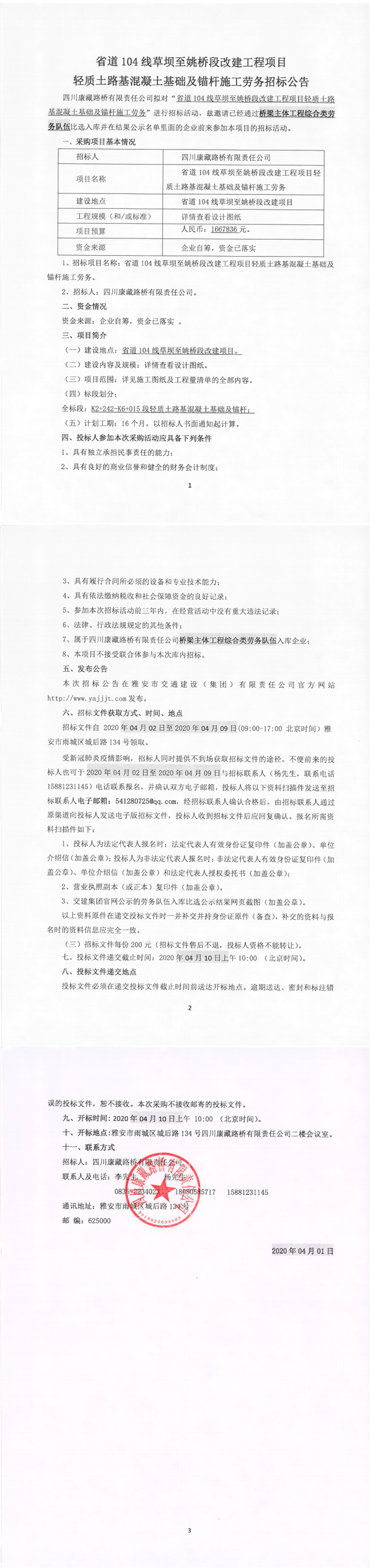 四川康藏路橋有限責(zé)任公司省道104線草壩至姚橋段改建工程項目輕質(zhì)土路基混凝土基礎(chǔ)及錨桿施工勞務(wù)招標(biāo)公告