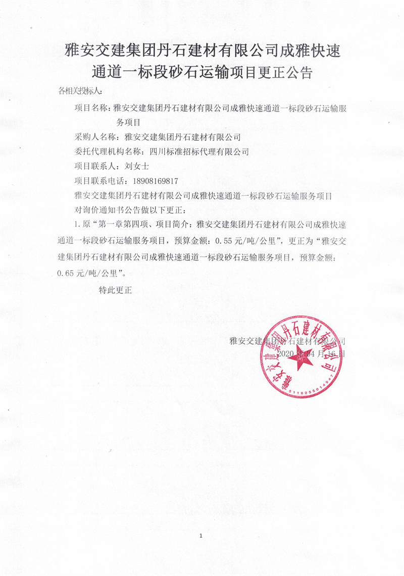 雅安交建集團丹石建材有限公司成雅快速通道一標段砂石運輸服務項目更正公告