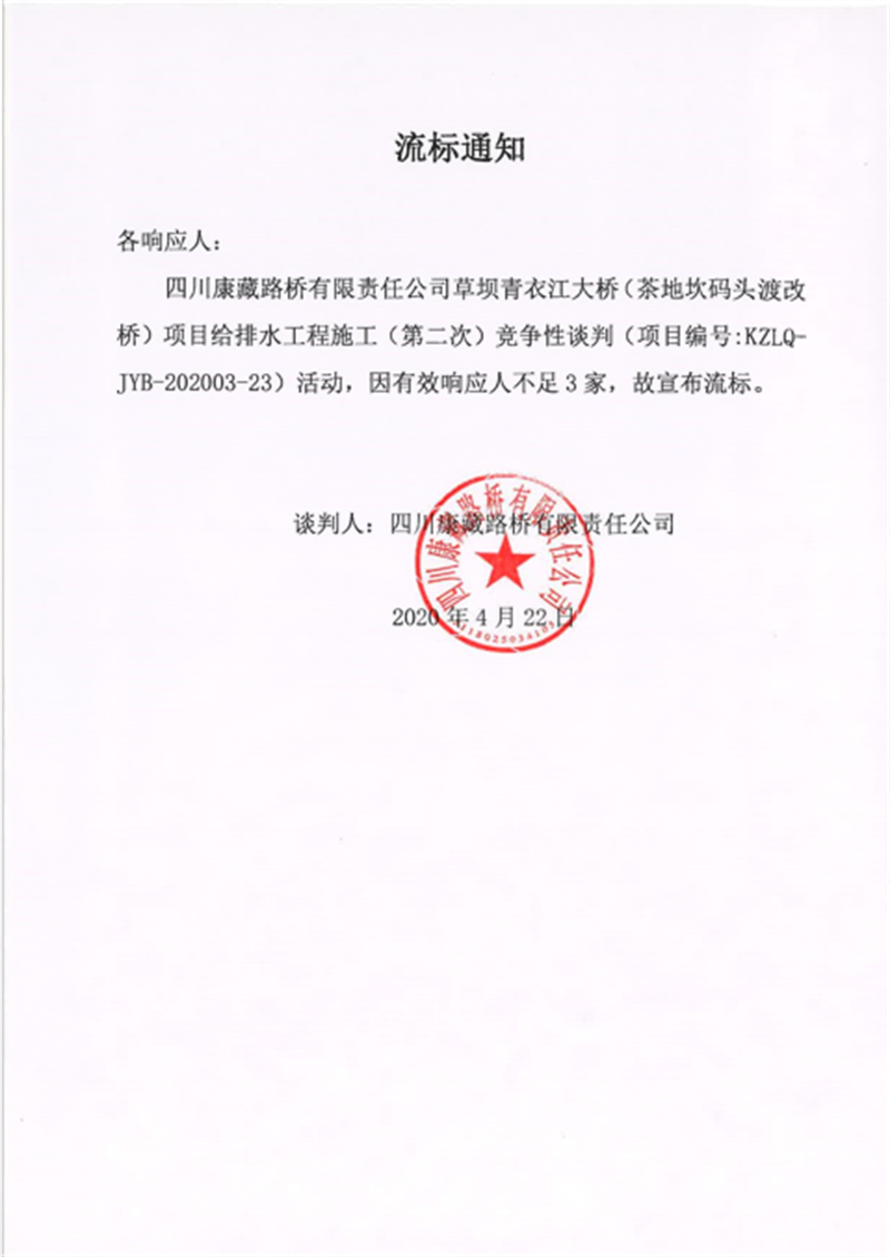 四川康藏路橋有限責(zé)任公司草壩青衣江大橋(茶地坎碼頭渡改橋)項(xiàng)目給排水工程施工(第二次)競爭性談判流標(biāo)通知