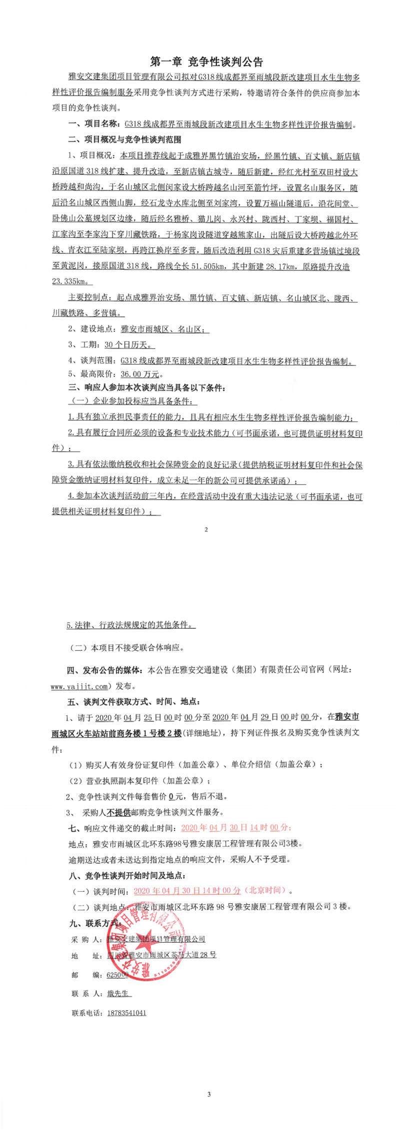 雅安交建集團(tuán)項(xiàng)目管理有限公司G318線成都界至雨城段新改建項(xiàng)目水生生物多樣性影響評(píng)價(jià)編制競(jìng)爭(zhēng)性談判公告