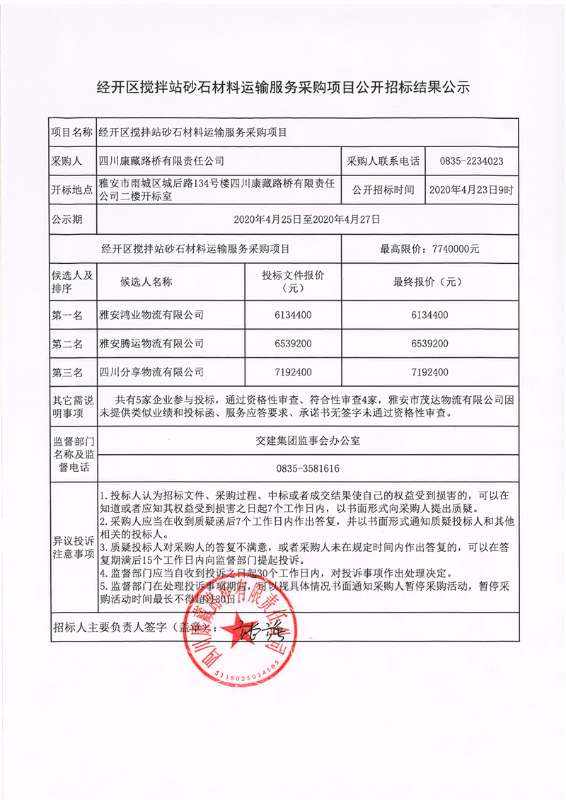 四川康藏路橋有限責(zé)任公司經(jīng)開(kāi)區(qū)攪拌站砂石材料運(yùn)輸服務(wù)采購(gòu)項(xiàng)目公開(kāi)招標(biāo)結(jié)果公示