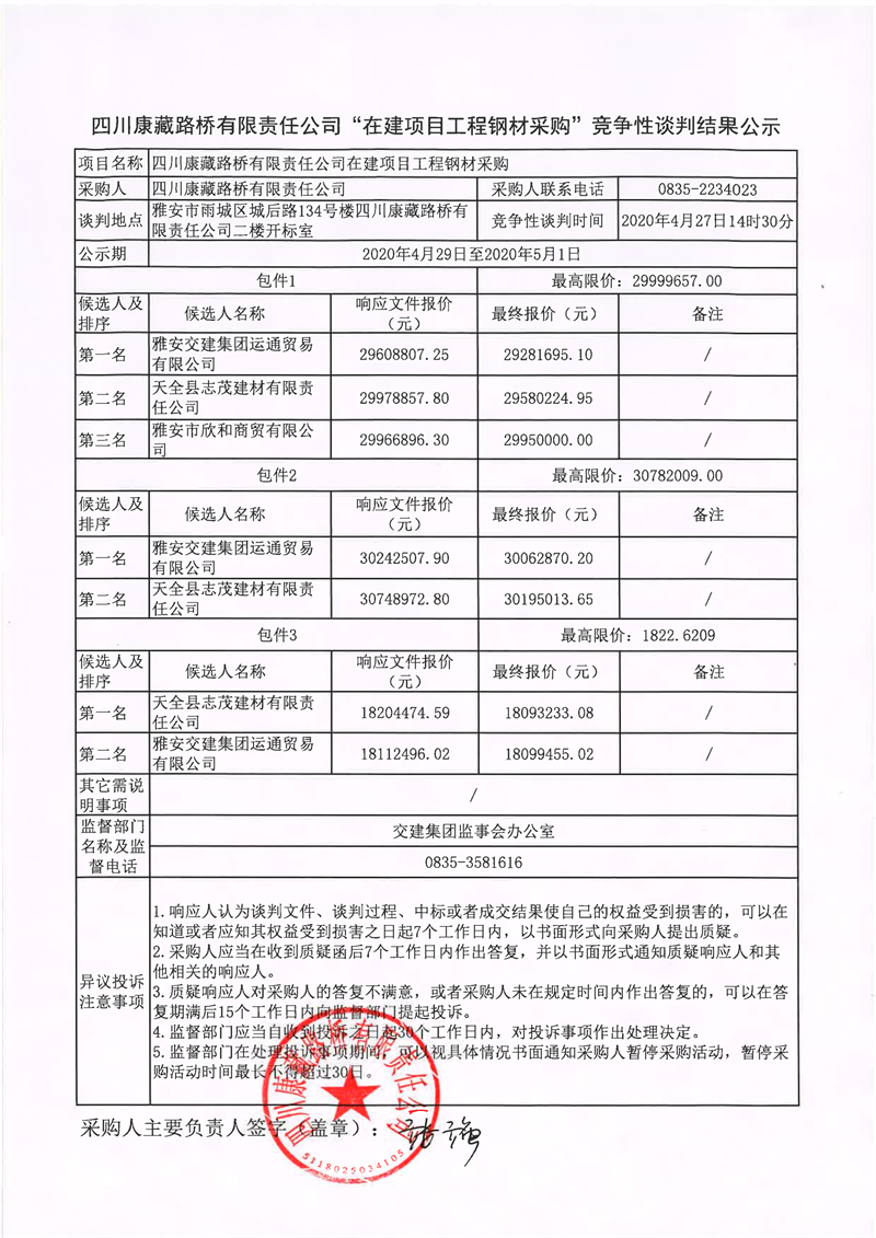四川康藏路橋有限責任公司“在建項目工程鋼材采購”競爭性談判結果公示