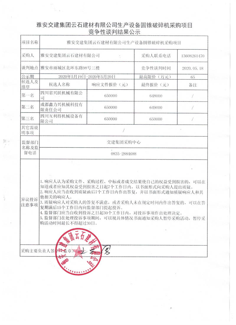雅安交建集團(tuán)云石建材有限公司生產(chǎn)設(shè)備圓錐破碎機(jī)采購項(xiàng)目競爭性談判結(jié)果公示