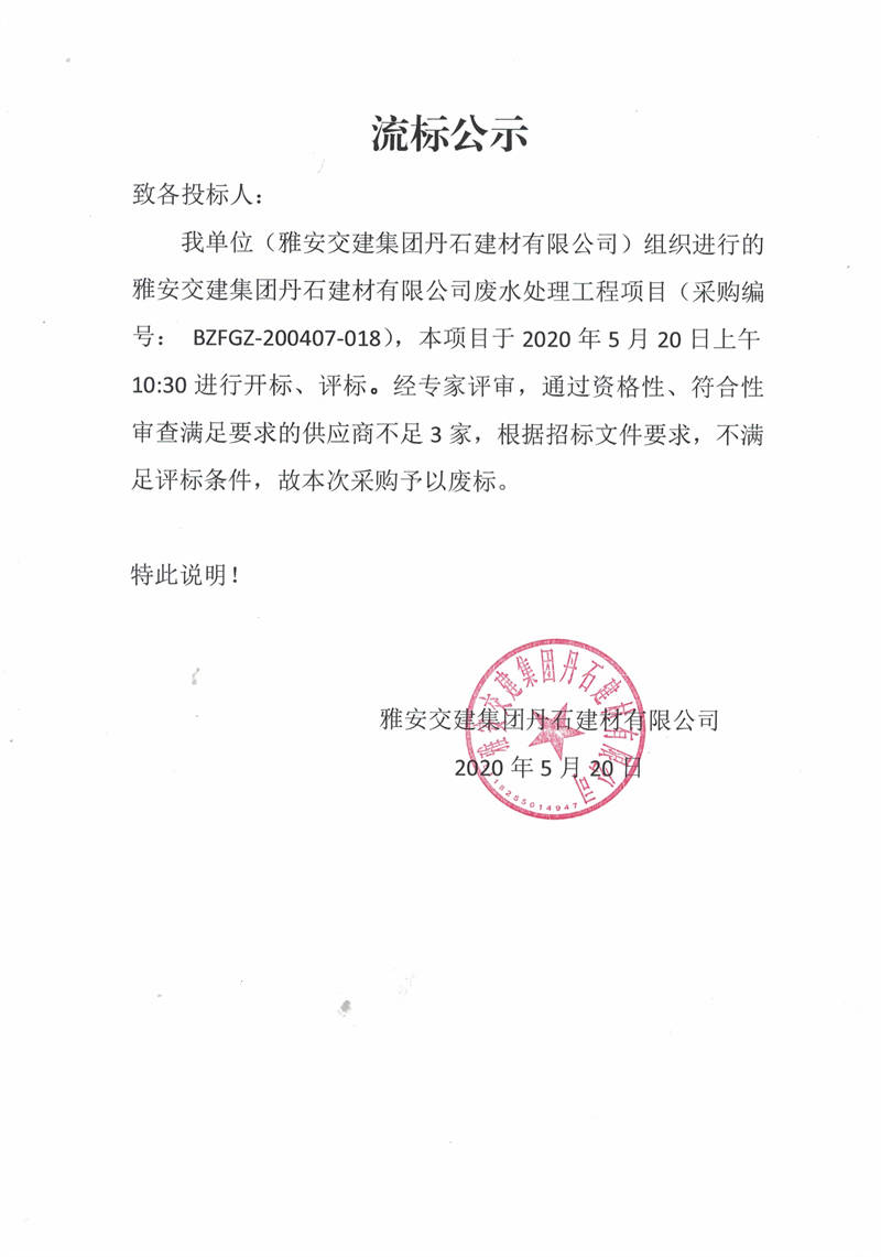 雅安交建集團(tuán)丹石建材有限公司廢水處理工程項(xiàng)目流標(biāo)公示