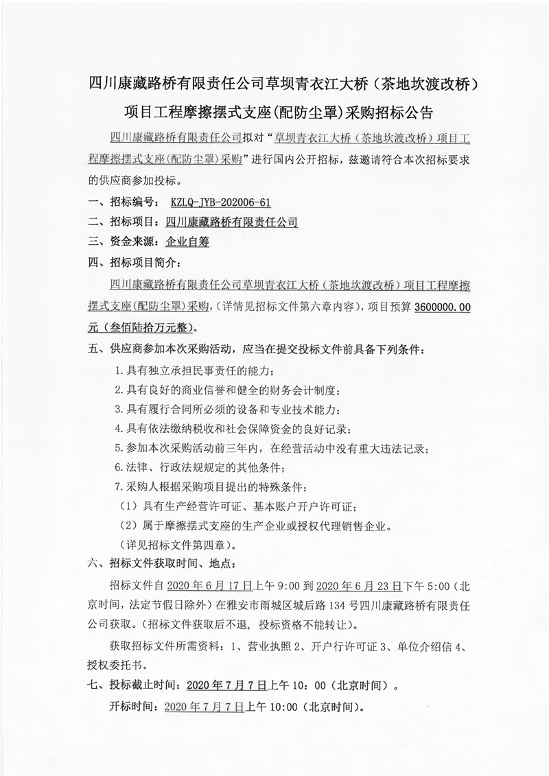 四川康藏路橋有限責任公司草壩青衣江大橋(茶地坎渡改橋)項目工程摩擦擺式支座(配防塵罩)采購招標公告
