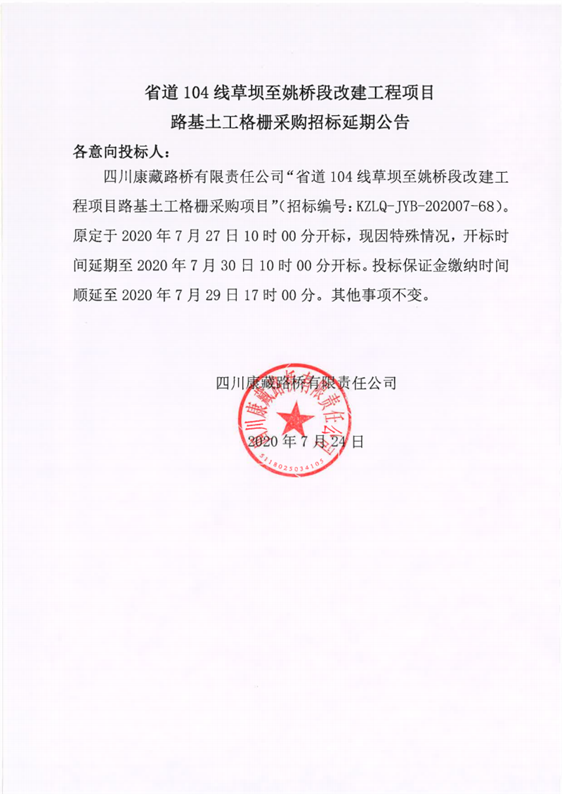 四川康藏路橋有限責(zé)任公司省道104線草壩至姚橋段改建工程項目路基土工格柵采購招標(biāo)延期公告