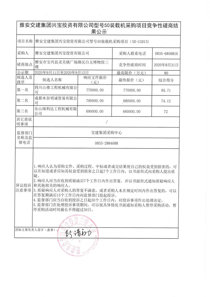 雅安交建集團(tuán)興寶投資有限公司型號50裝載機采購項目競爭性磋商結(jié)果公示