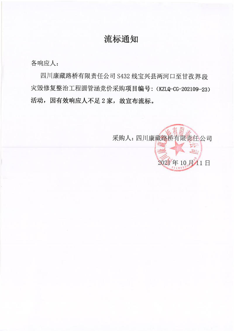 四川康藏路橋有限責(zé)任公司S432線(xiàn)寶興縣兩河口至甘孜界段災(zāi)毀修復(fù)整治工程圓管涵采購(gòu)競(jìng)價(jià)流標(biāo)通知