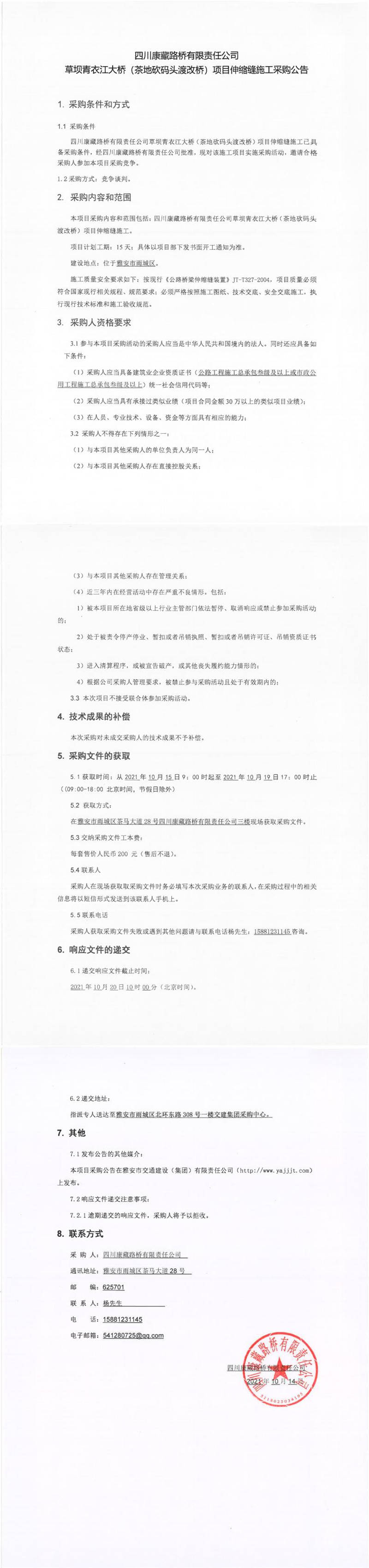 四川康藏路橋有限責(zé)任公司草壩青衣江大橋(茶地坎碼頭渡改橋)項目伸縮縫施工采購公告