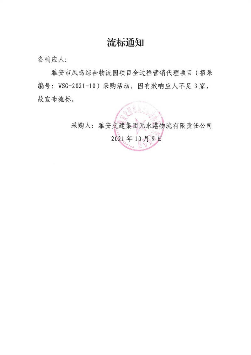 雅安交建集團(tuán)無(wú)水港物流有限責(zé)任公司雅安市鳳鳴綜合物流園項(xiàng)目全過(guò)程營(yíng)銷(xiāo)代理項(xiàng)目流標(biāo)通知
