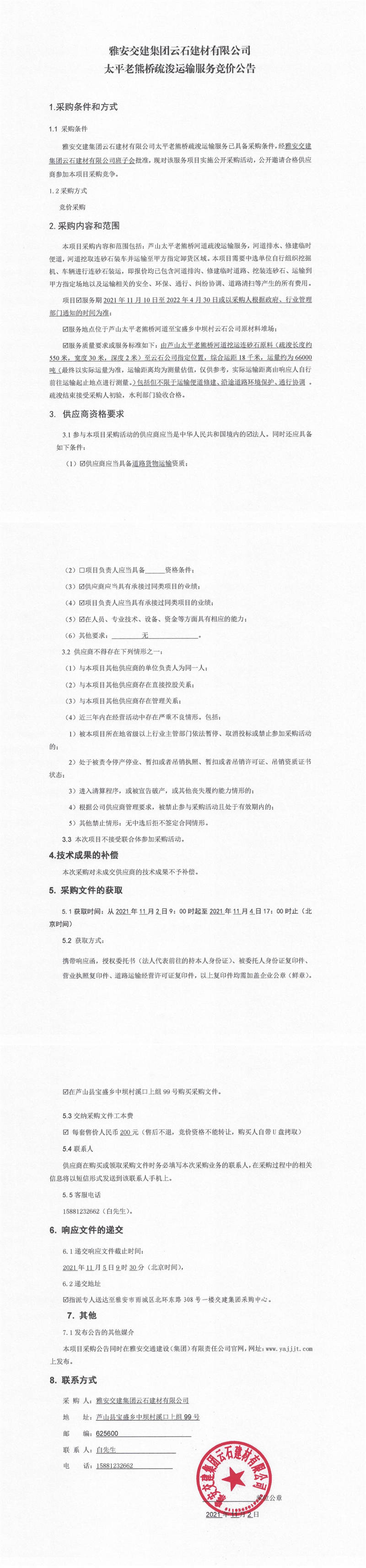 雅安交建集團云石建材有限公司太平老熊橋疏浚運輸服務競價公告