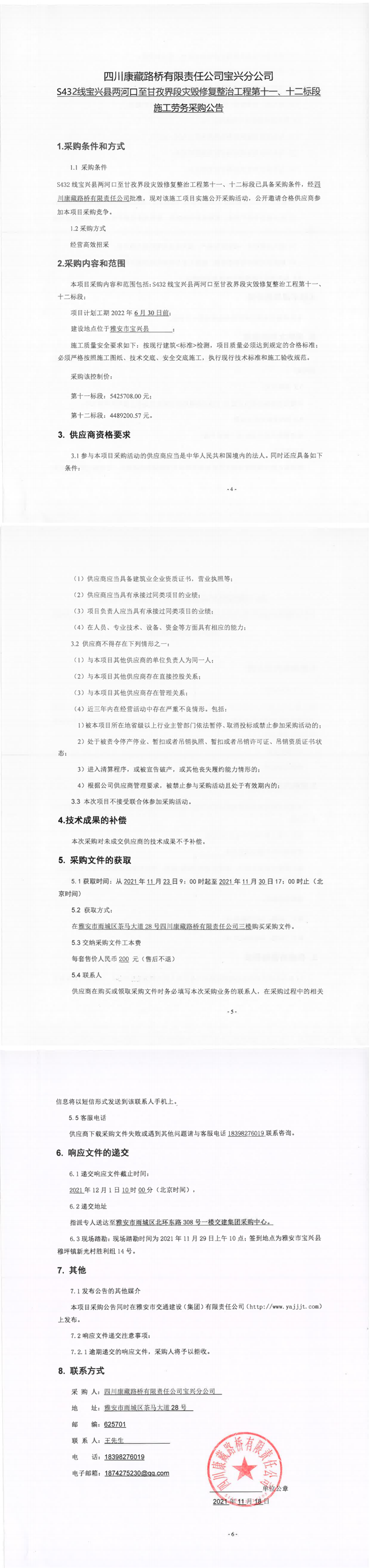 四川康藏路橋有限責任公司寶興分公司S432線寶興縣兩河口至甘孜界段災(zāi)毀修復(fù)整治工程第十一、十二標段施工勞務(wù)采購公告