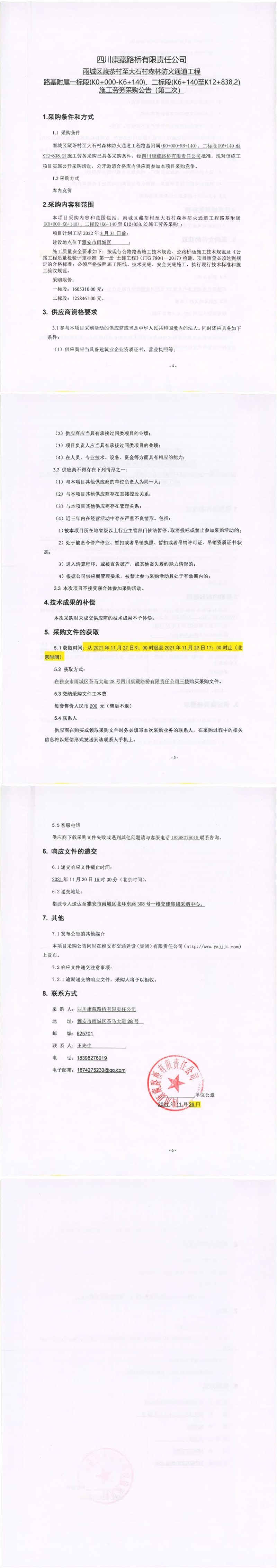 四川康藏路橋有限責(zé)任公司雨城區(qū)藏茶村至大石村森林防火通道工程路基附屬一標(biāo)段(K0+000-K6+140)、二標(biāo)段(K6+140至K12+838.2)施工勞務(wù)采購(gòu)公告(第二次)