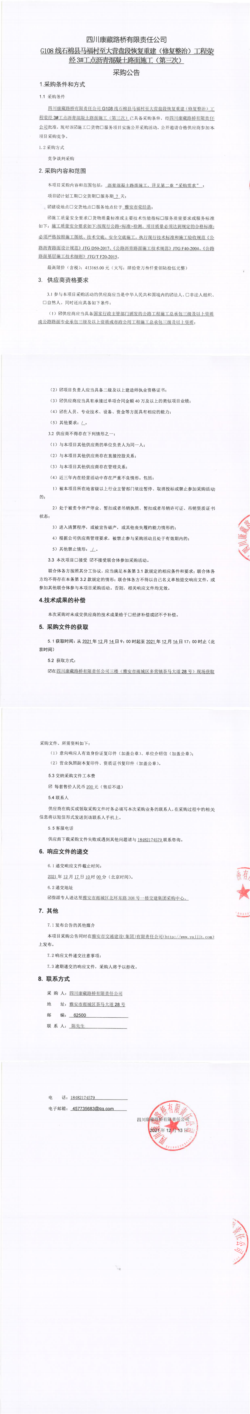 四川康藏路橋有限責任公司G108線石棉縣馬福村至大營盤段恢復(fù)重建(修復(fù)整治)工程滎經(jīng)3#工點瀝青混凝土路面施工(第三次)采購公告