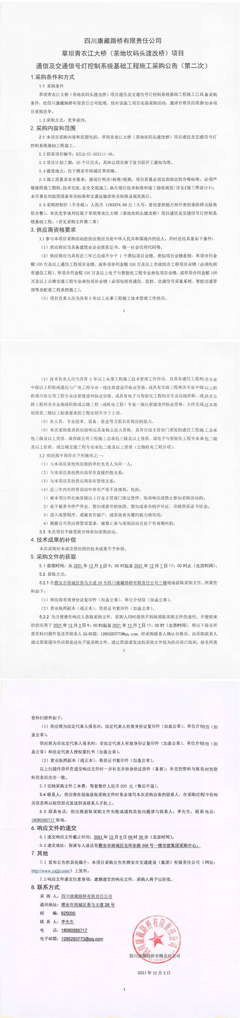 四川康藏路橋有限責(zé)任公司草壩青衣江大橋(茶地坎碼頭渡改橋)項(xiàng)目通信及交通信號(hào)燈控制系統(tǒng)基礎(chǔ)工程施工采購公告(第二次)