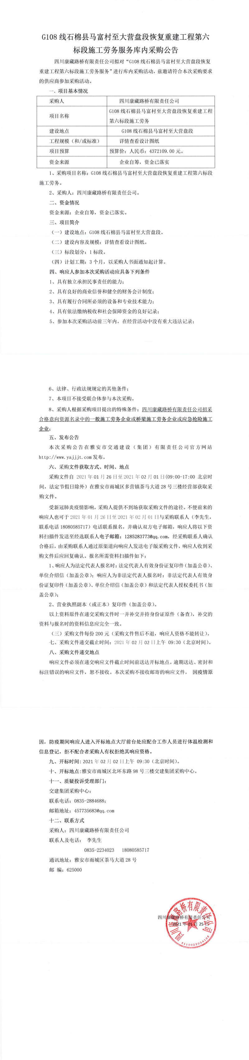 四川康藏路橋有限公司G108線石棉縣馬富村至大營(yíng)盤(pán)段恢復(fù)重建工程第六標(biāo)段施工勞務(wù)服務(wù)庫(kù)內(nèi)采購(gòu)公告