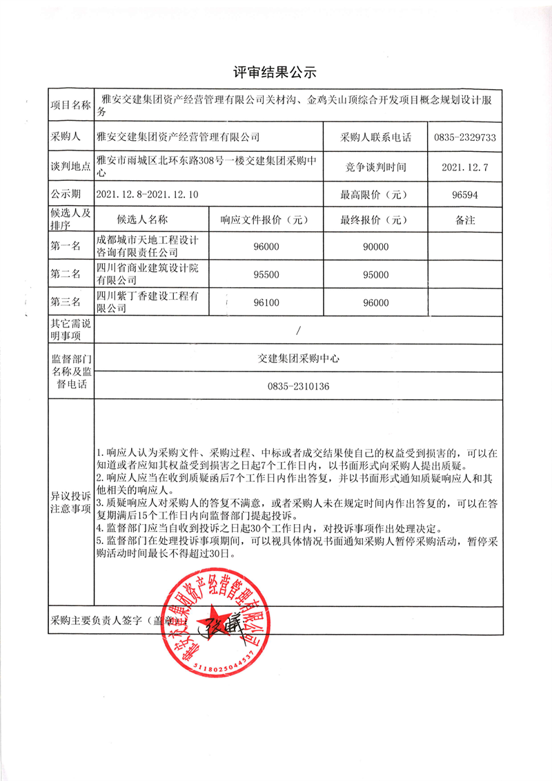 雅安交建集團(tuán)資產(chǎn)經(jīng)營(yíng)管理有限公司關(guān)材溝、金雞關(guān)山頂綜合開(kāi)發(fā)項(xiàng)目概念規(guī)劃設(shè)計(jì)服務(wù)評(píng)審結(jié)果公示