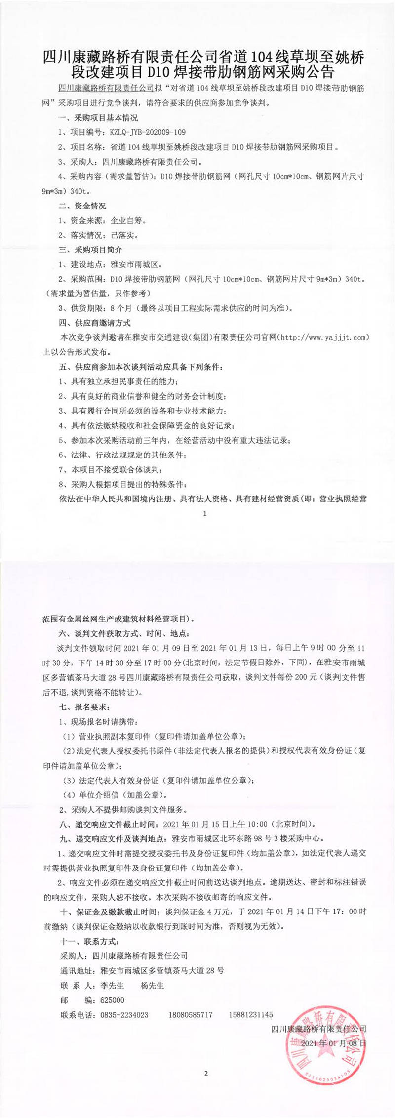 四川康藏路橋有限責(zé)任公司省道104線草壩至姚橋段改建項目D10焊接帶肋鋼筋網(wǎng)采購公告