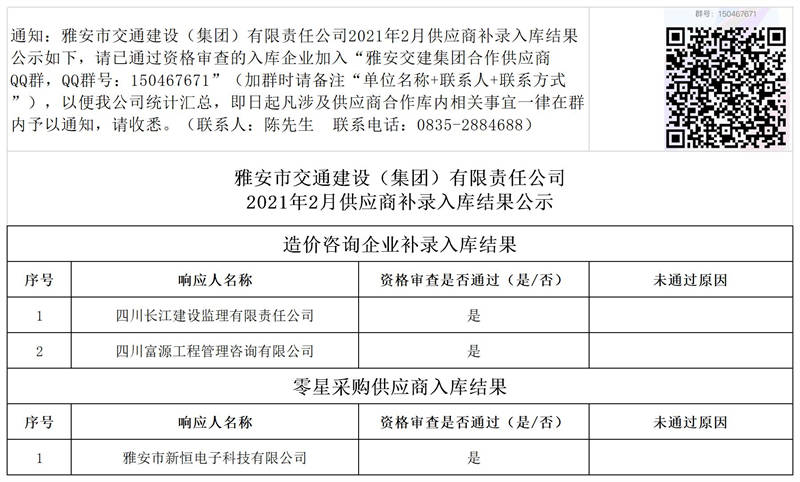 雅安市交通建設(shè)(集團(tuán))有限責(zé)任公司2021年2月供應(yīng)商補(bǔ)錄入庫結(jié)果公示