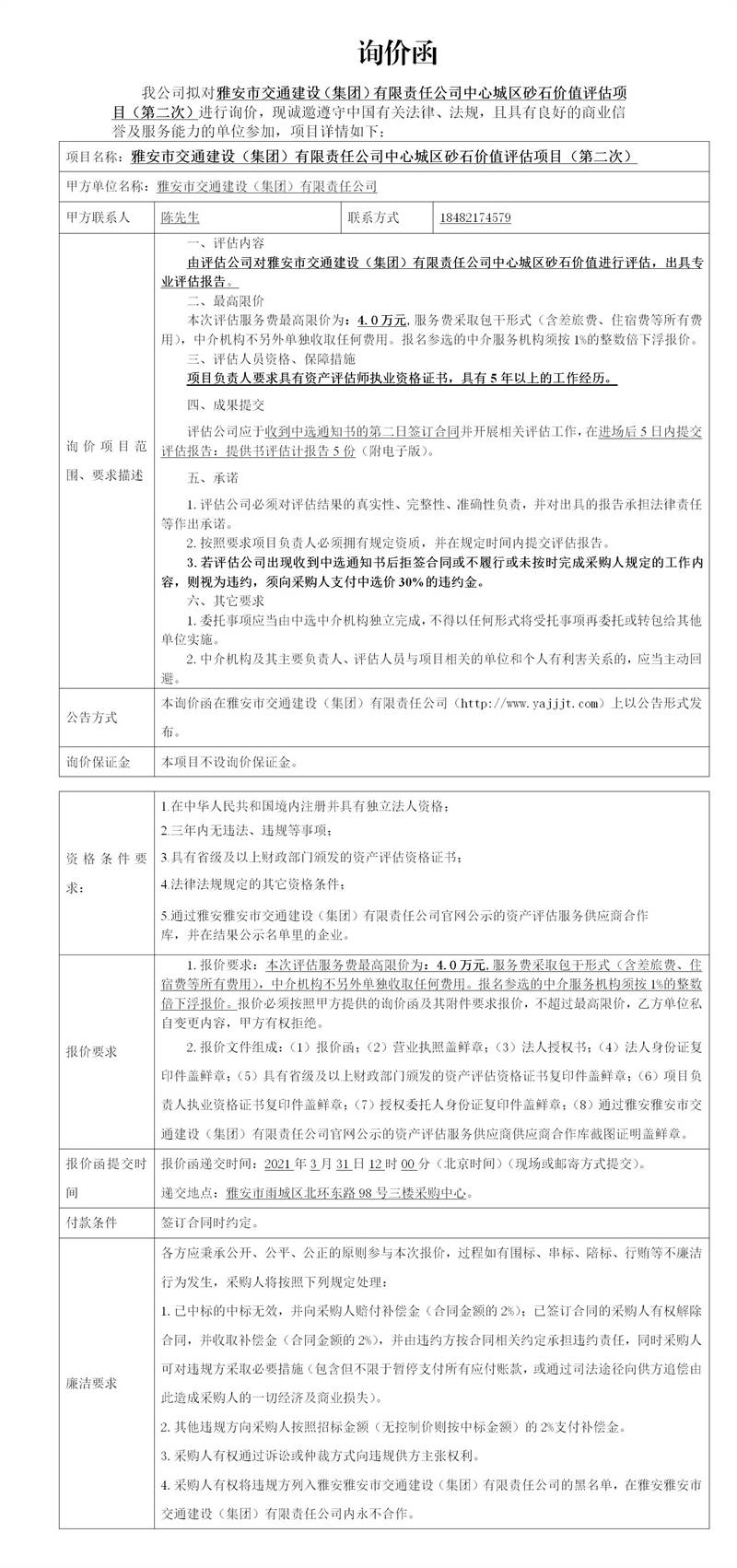 雅安市交通建設(shè)(集團)有限責(zé)任公司中心城區(qū)砂石價值評估項目(第二次)詢價函