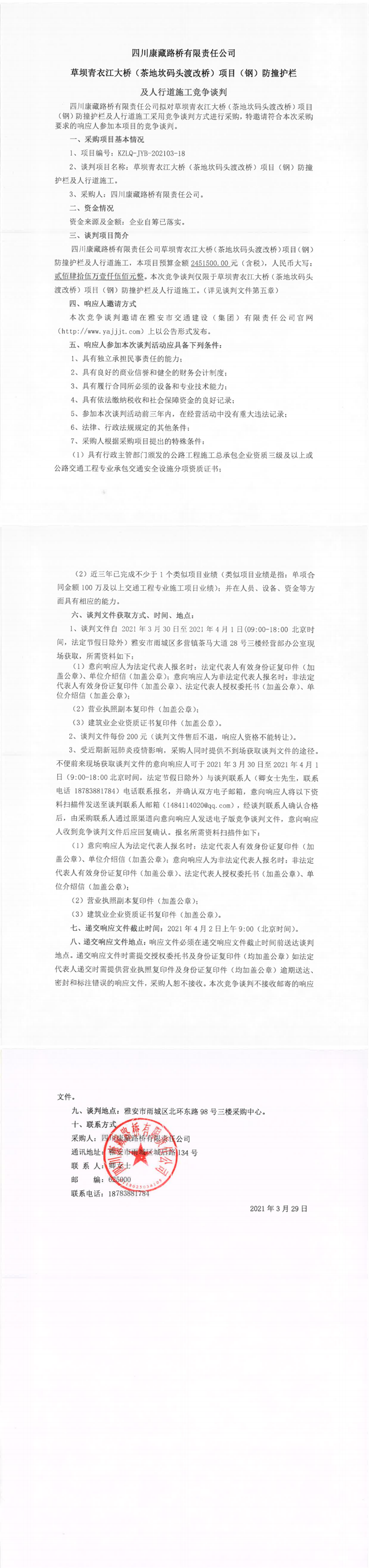 四川康藏路橋有限責(zé)任公司草壩青衣江大橋(茶地坎碼頭渡改橋)項目(鋼)防撞護欄及人行道施工競爭談判公告