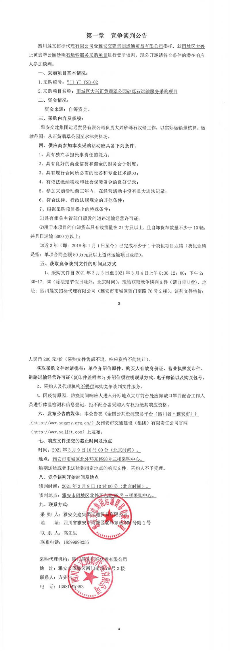 雅安交建集團(tuán)運(yùn)通貿(mào)易有限公司雨城區(qū)大興正黃翡翠公園砂礫石運(yùn)輸服務(wù)采購(gòu)項(xiàng)目競(jìng)爭(zhēng)談判公告