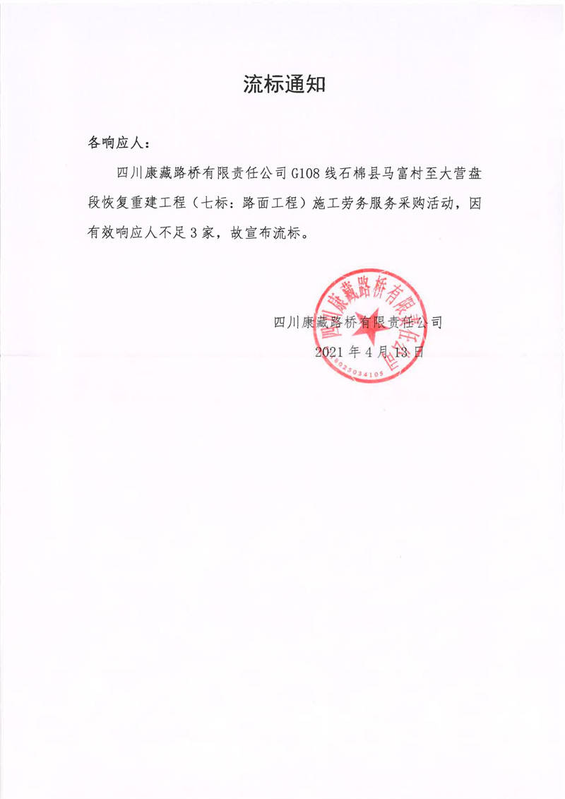 四川康藏路橋有限責任公司G108線石棉縣馬富村至大營盤段恢復重建工程(七標:路面工程)施工勞務服務流標通知