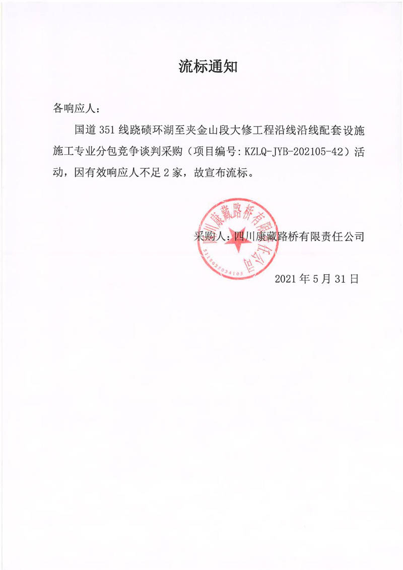 四川康藏路橋有限責(zé)任公司國道351線蹺磧環(huán)湖至夾金山段大修工程沿線沿線配套設(shè)施施工專業(yè)分包競爭談判采購流標(biāo)通知