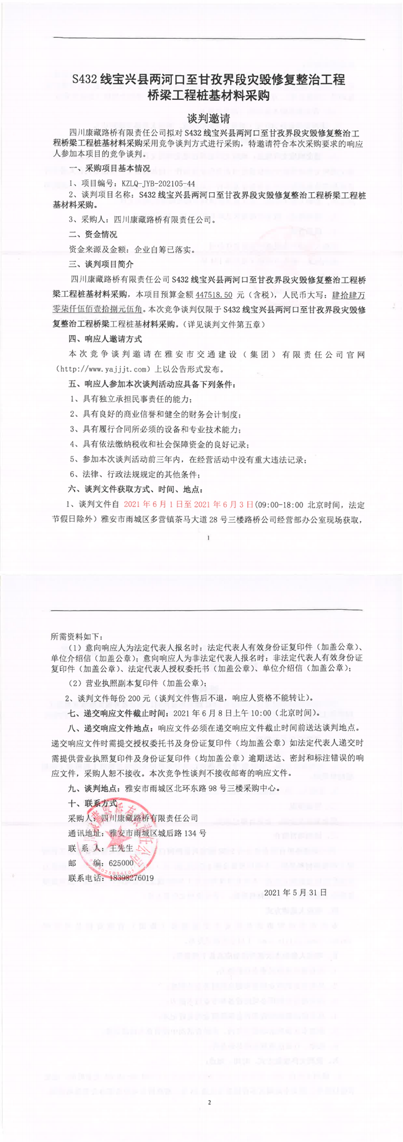 四川康藏路橋有限責任公司S432線寶興縣兩河口至甘孜界段災毀修復整治工程橋梁樁基材料采購競爭談判公告