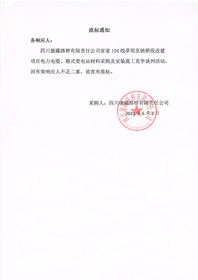四川康藏路橋有限責(zé)任公司省道104線草壩至姚橋段改建項(xiàng)目電力電纜、箱式變電站材料采購及安裝施工競爭談判流標(biāo)通知