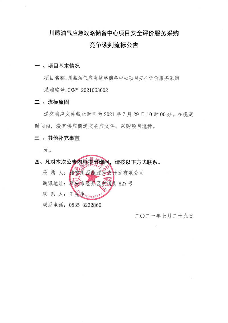 雅安川西能源投資開發(fā)有限公司川藏油氣應(yīng)急戰(zhàn)略儲備中心項(xiàng)目安全評價(jià)服務(wù)采購競爭談判流標(biāo)公告