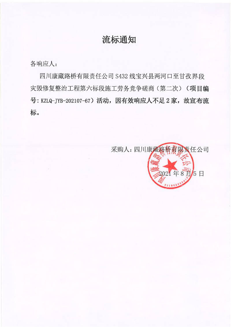 四川康藏路橋有限責(zé)任公司S432線寶興縣兩河口至甘孜界段災(zāi)毀修復(fù)整治工程第六標(biāo)段施工勞務(wù)競爭磋商(第二次)流標(biāo)通知